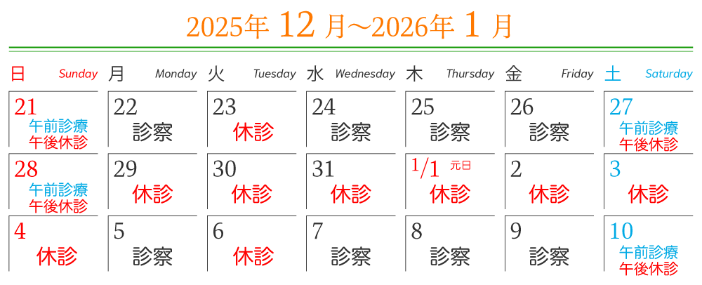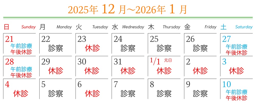 HOME お知らせ 年末年始休診のお知らせ 2025年11月22日 2025年12月29日(月)から2026年1月4日(日)まで年末年始の休診とさせていただきます。1月5日(月)から通常診療いたします。ご不便をおかけいたしますが、よろしくお願いいたします。